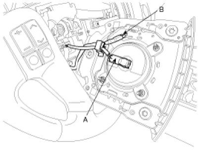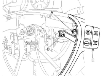 4. Disconnect the cruise control switch connector (A) and then remove the cruise control switch (C) with two screws (B).