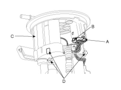 3. Separate the flange assembly (C) from the fuel pump assembly with the three fixing hooks (D) disengaged.