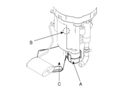 7. Pull the electric pump (B) & the pre-filter (C) from the fuel filter.