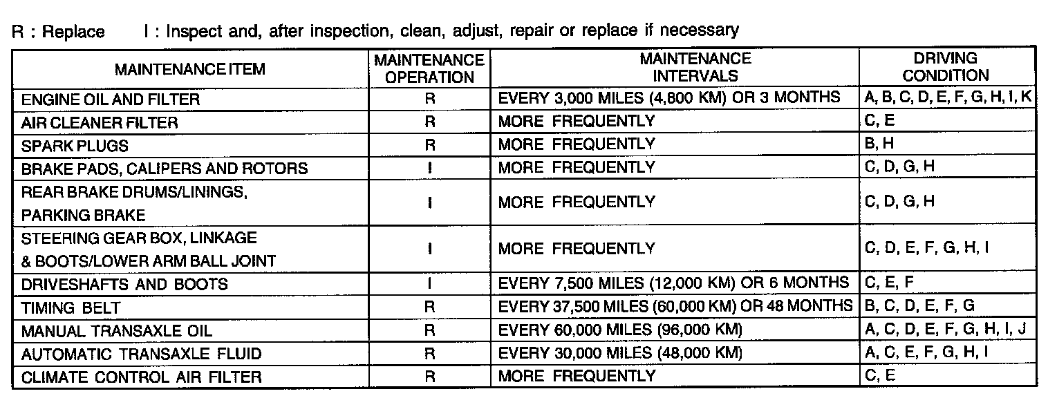 The following items must be serviced more frequently on cars normally used under severe driving conditions. Refer to the chart below for the appropriate maintenance intervals.