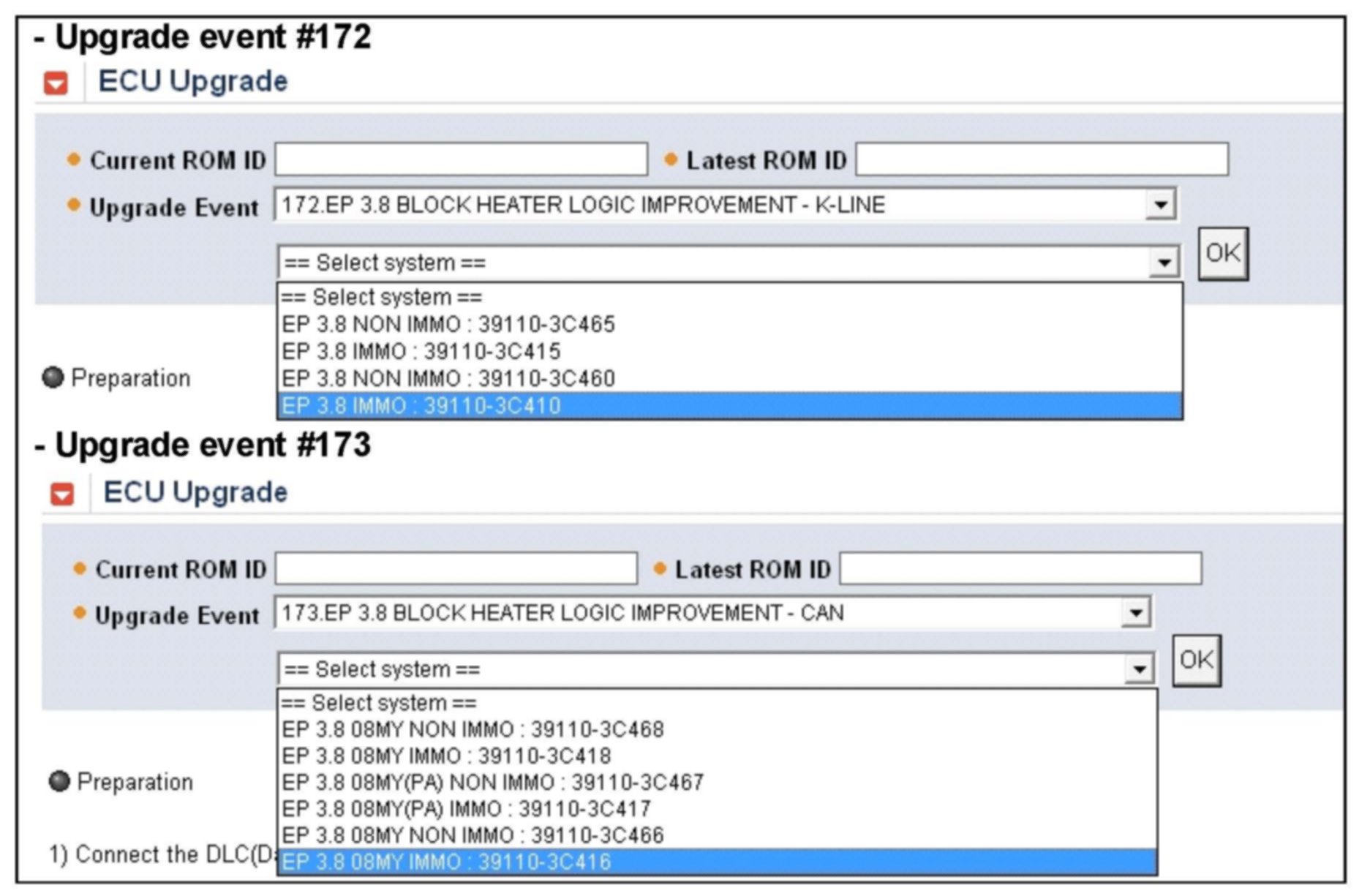1. Within the ECU Upgrade screen, select Manual Mode in the left column, then select the appropriate upgrade event# from the table below. Select the appropriate control unit part number with reference to the ROM ID Information Table and click OK.