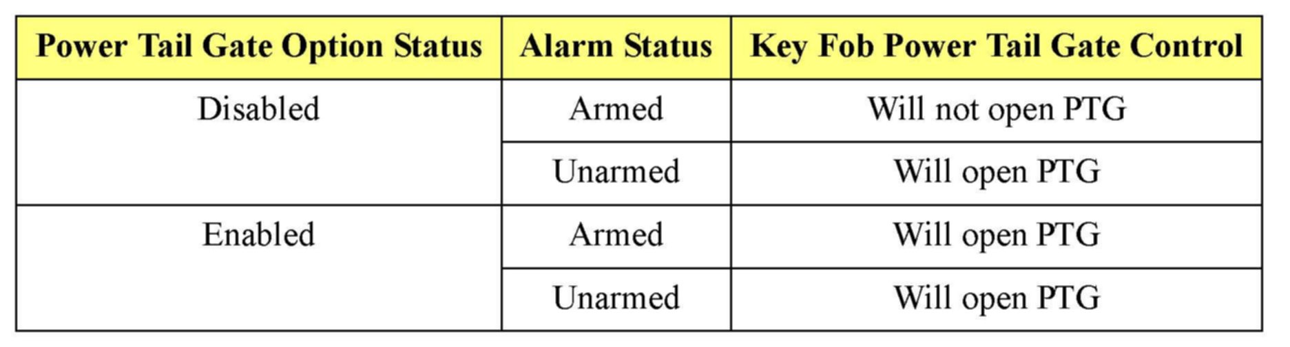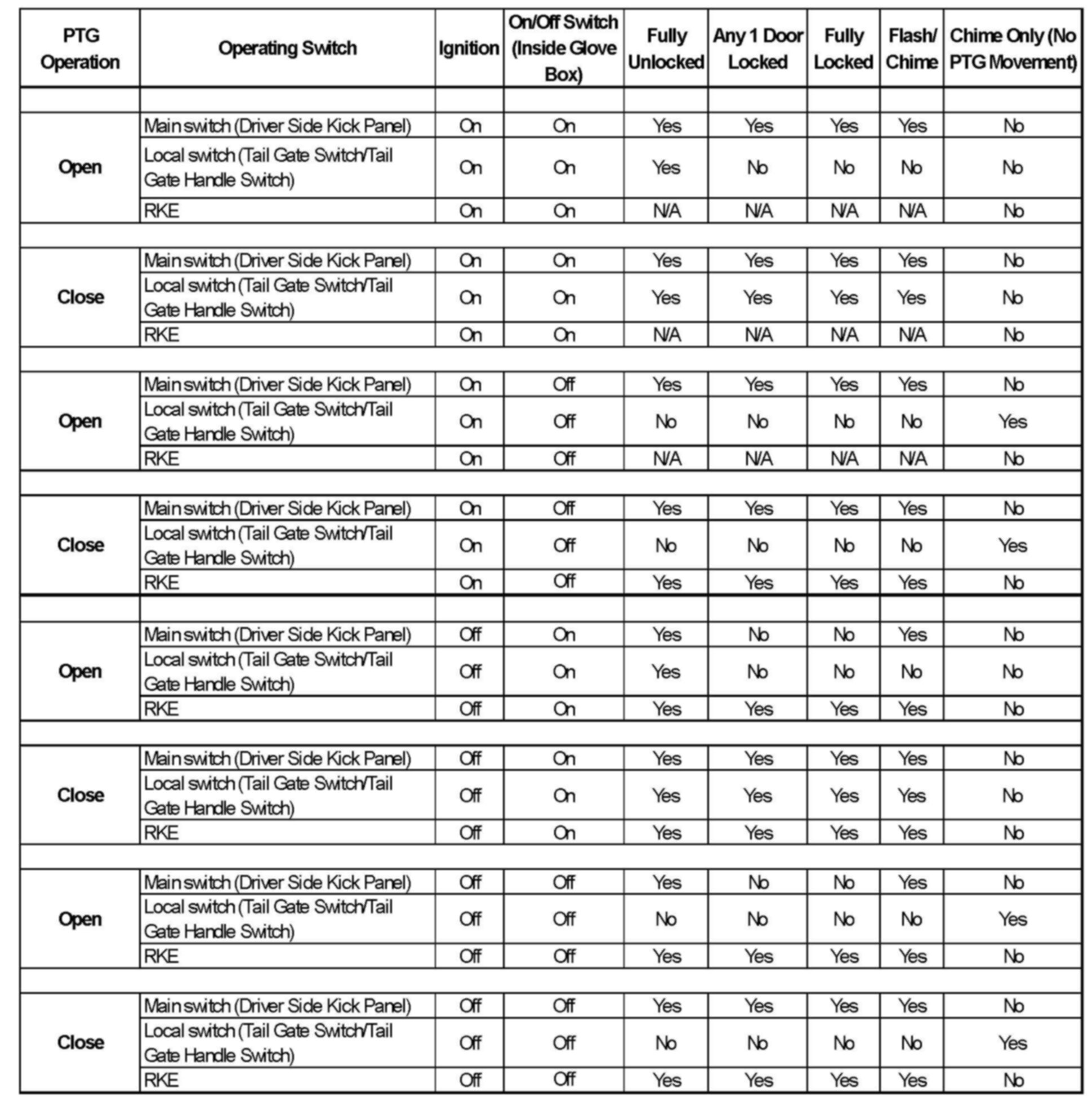 This chart can be used for diagnosis of power tail gate (PTG) operation.