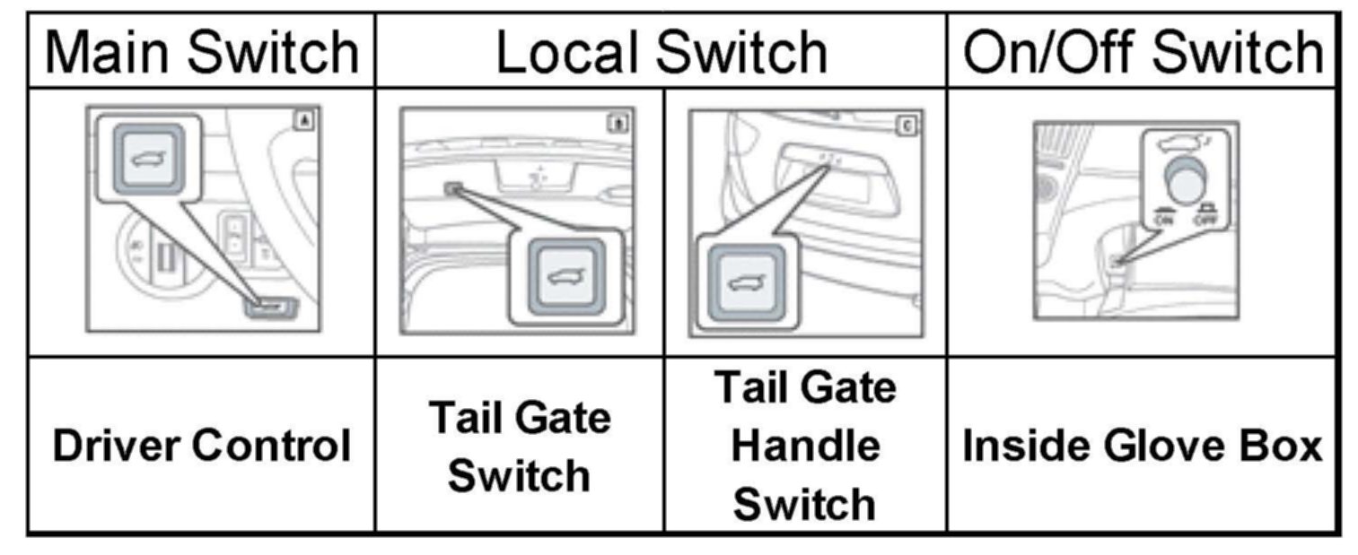 When the power ON/OFF switch is off (not depressed), the power tail gate cannot be controlled with tail gate switch or tail gate handle switch. However, the tail gate can still be controlled with key fob or main switch.