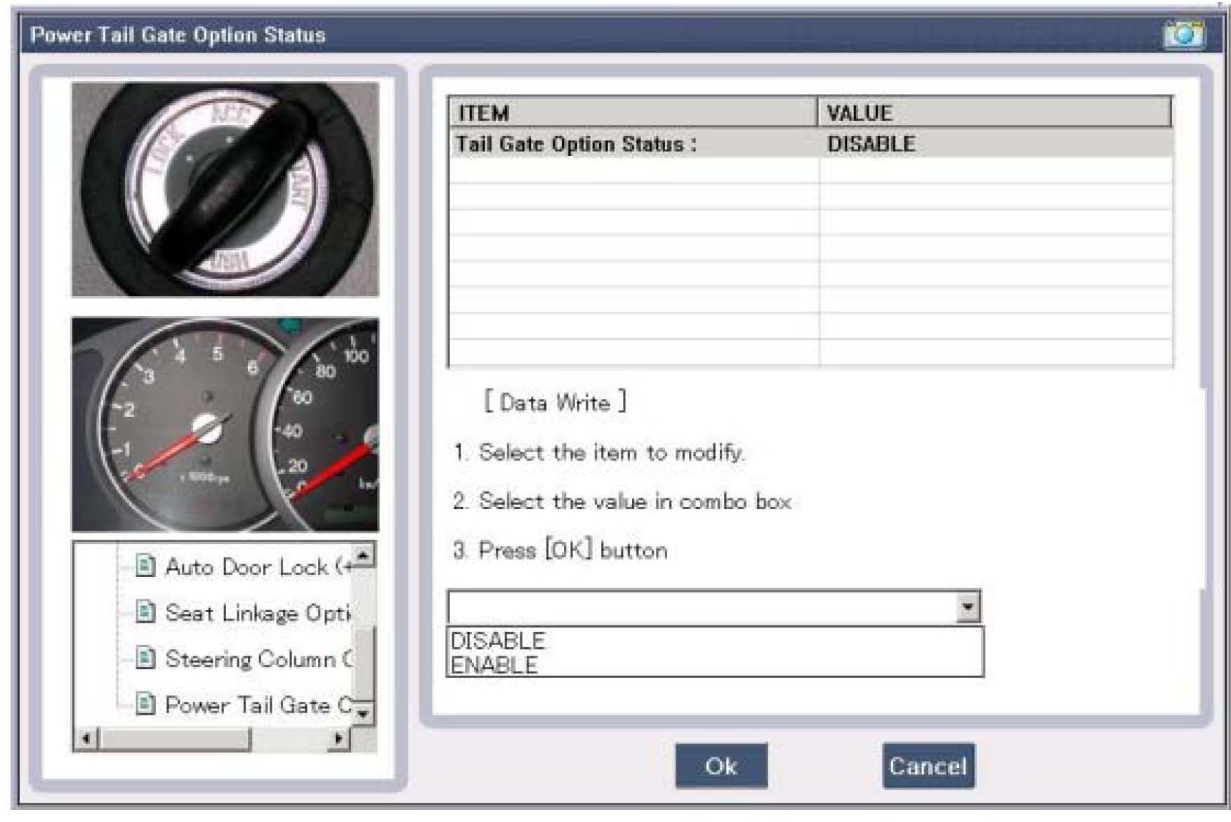 Some BCM's allow the Power Tail Gate Option Status to be changed using the BCM User Option section of GDS. The factory default setting is "Disabled".