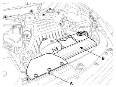 2. Disconnect the alternator connector (A), and remove the cable from alternator "B" terminal (B).