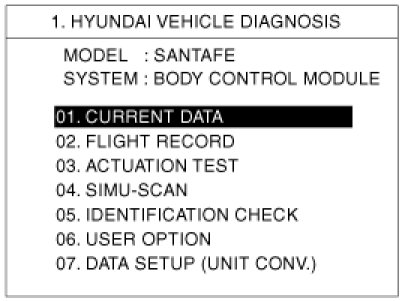 3. Select "Current data", if you will check current data of BCM. It provides power supply status, multi function status, lamp status, door status, lock system status, wiper, auto light status and so on.