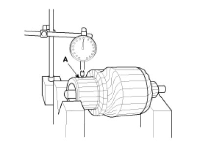 4. Check the commutator (A) surface. If the surface is dirty or burnt, resurface with emery cloth or a lathe within the following specifications, or recondition with #500 or #600 sandpaper (B).