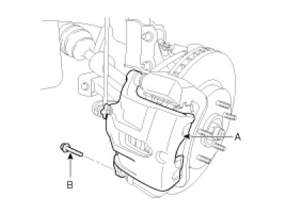 2. Loosen the guide rod bolt (B) and pivot the caliper (A) up out of the way.