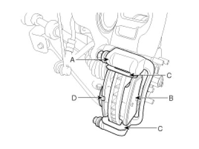3. Replace pad shim (D), pad retainers (C) and brake pads (B) in the caliper bracket (A).