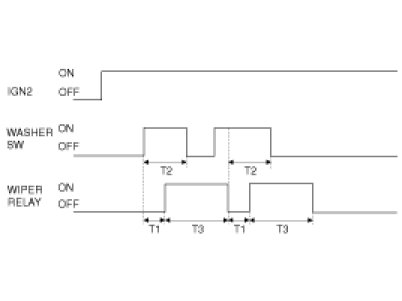 (2) If the Washer SW is ON in the IGN2 SW ON state, then the Wiper output shall be ON after T1, and if the Washer SW is ON over 0.6 seconds, after the Washer SW is OFF and the Wiper output shall be ON for 2.5 - 3.8 seconds and then, the Wiper output shall be OFF. However, WASHER SW input shall be disregarded during the Washer Wiper operating, but after the Washer Wiper operating, WASHER SW input be accepted first.