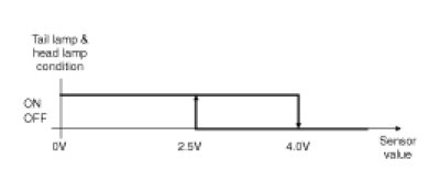 (2) IGN1 SW ON state, if the supply voltage of the AUTO LIGHT SENSOR is less than 4v or more than 6v, it is determined as the fault. In the fault state, in case of the AUTO LIGHT SW is ON, always HEAD LAMP RELAY shall be ON regardless of the Sensor value. FILTERING TIME for the fault and recovery with regard to the supply voltage is 300 msec respectively.