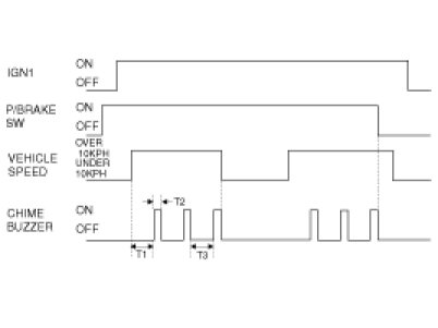 In the state that the IGN1 is ON or the Parking Brake is pulled, if the speed of vehicle is maintained over 10 km/h for 2 - 3 seconds or more, then the Chime Buzzer output shall be continued with 1 second cycle of the ON/OFF (0.3/0.7 seconds). But, after the speed of vehicle is maintained over 10 km/h for 2 - 3 seconds or more, if the Parking Brake is pulled, output immediately.