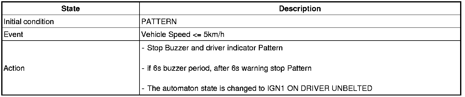 In the state that the IGN1 is ON or the Parking Brake is pulled, if the speed of vehicle is maintained over 10 km/h for 2 - 3 seconds or more, then the Chime Buzzer output shall be continued with 1 second cycle of the ON/OFF (0.3/0.7 seconds). But, after the speed of vehicle is maintained over 10 km/h for 2 - 3 seconds or more, if the Parking Brake is pulled, output immediately.