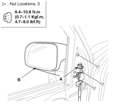 2. After disconnecting the connector (A), remove the outside rear view mirror (B).