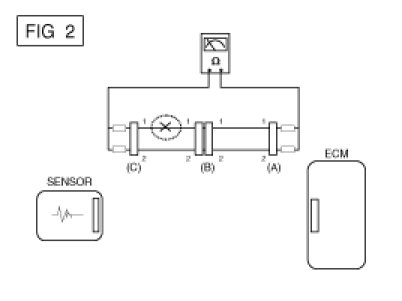 B. Disconnect connector (B), and measure for resistance between connector (C) and (B1) and between (B2) and (A) as shown in [FIG. 3].