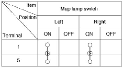 Remove the overhead console lamp assembly then check for continuity between terminals. If the continuity is not as specified, replace the map lamp switch.