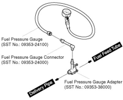(2) Install the special service tool for measuring the fuel pressure in between the fuel feed tube and the fuel delivery pipe .