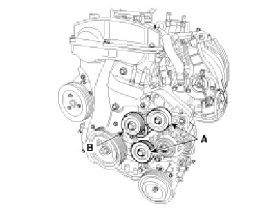 11. Remove the idler (A) and drive belt tensioner pulley (B).
