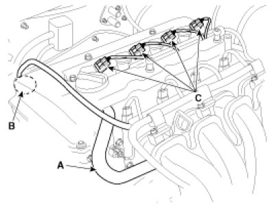 16. Disconnect the ignition coil connectors (C), and then remove the ignition coils.