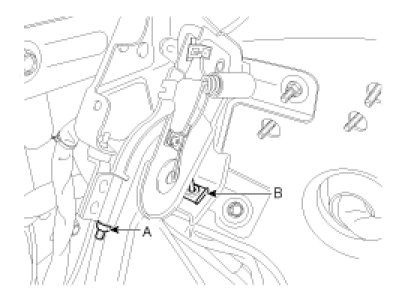 6. Remove the parking brake cable adjusting nut(A) and the fixing clip(B), and then remove the parking brake pedal.
