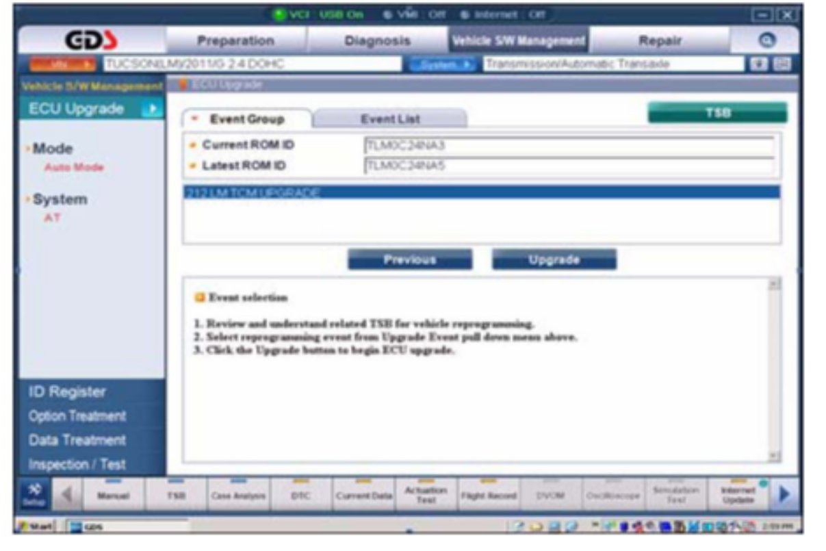 This bulletin provides a procedure to update the TCM for 2011 Tucson 2.4L vehicles with automatic transaxles.