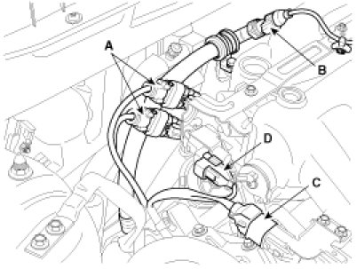 3. Disconnect the RH front and rear oxygen sensor connectors(A), the power steering sensor connector(B), the RH injector harness connector(C) and the VIS solenoid valve connector(D).