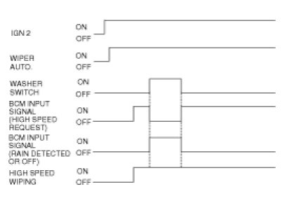 In IGN2 ON state, if AUTO switch input (LIN Communication) is ON then both Low Speed Wiping (LIN COMMUNICATION) and High Speed Wiping (LIN COMMUNICATION) are controlled by the RAIN SENSOR INPUT signal.