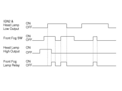 In case of (IGN2 = ON) & (HEADLAMP LOW OUTPUT= ON) & (HEADLAMP HIGH OUTPUT OFF) status, if FRONT FOG SWITCH input is detected, FRT FOG LAMP RELAY OUTPUT (O FOG FRONT RELAY) is turned ON.