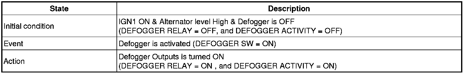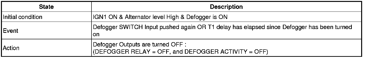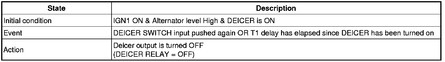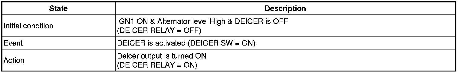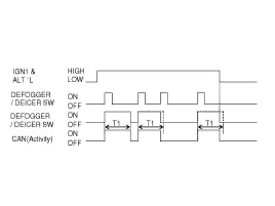 If alternator input is changed to low or IGN1 input is changed to Off, Defogger output and DEICER output should be turned OFF immediately.