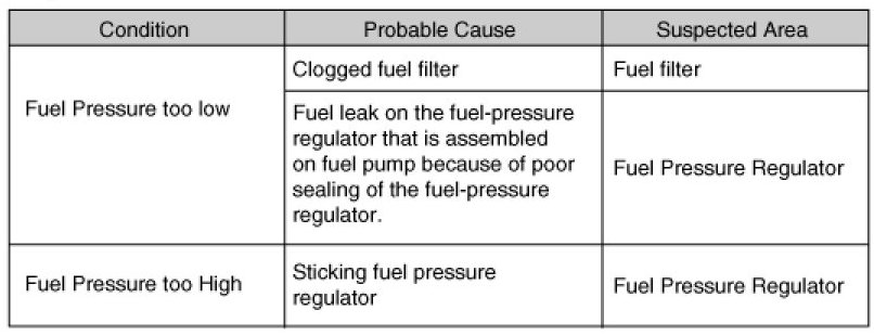 If the measured fuel pressure differs from the standard value, perform the necessary repairs using the table below.
