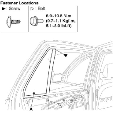 2. Loosen the screws and bolt, then remove the quarter glass (A).