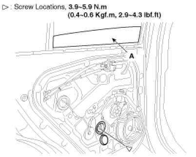 3. Carefully move the glass (A) until you can see the bolts, then loosen them. Separate the glass from the glass run and carefully pull the glass out through the window slot.