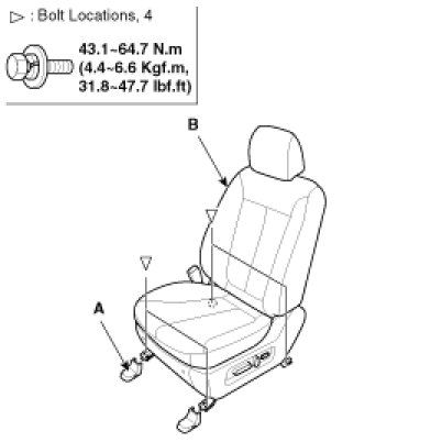 4. After loosening the mounting bolts, then disconnect the seat back frame (A) and seat cushion frame (B).