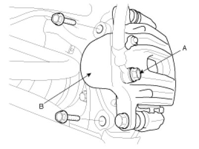 2. Loosen the hose eye-bolt (A) and caliper mounting bolts, then remove the rear caliper assembly(B).