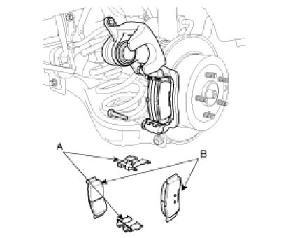 2. Replace shims (A), pad retainers (B), and brake pads (C).