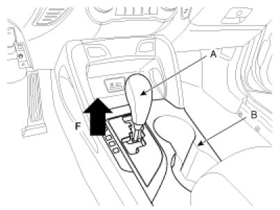1. Pull the gear knob (A) in the direction of the "F" and remove it, and then remove the console upper cover (B).