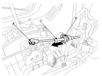 3. Take off the clip (A) and the clamp (B) and then remove the shift cable (C).