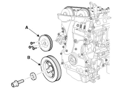 12. Remove the water pump pulley (A), crankshaft pulley (B).