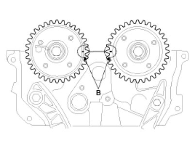 4. Set the crankshaft so that the key (A) of crankshaft will be aligned with the mating surface of main bearing cap. Put the intake and exhaust camshaft assembly so that the TDC marks (B) of the intake and exhaust CVVT sprockets will be aligned with the top surface of cylinder head. As a result of this, the piston of No.1 cylinder is placed at the top dead center on compression stroke.