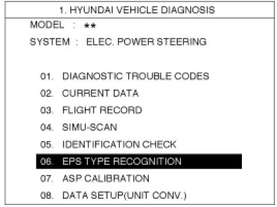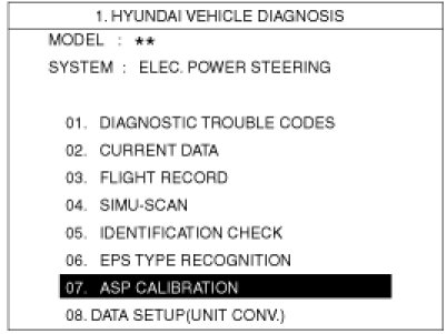 - Be careful not to disconnect any cables connected to the vehicle or scan tool during ASP calibration or EPS type recognition.