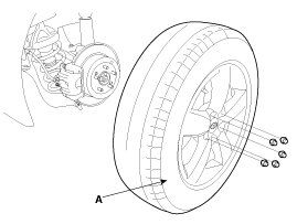 Be careful not to damage to the hub bolts when removing the front wheel and tire (A).