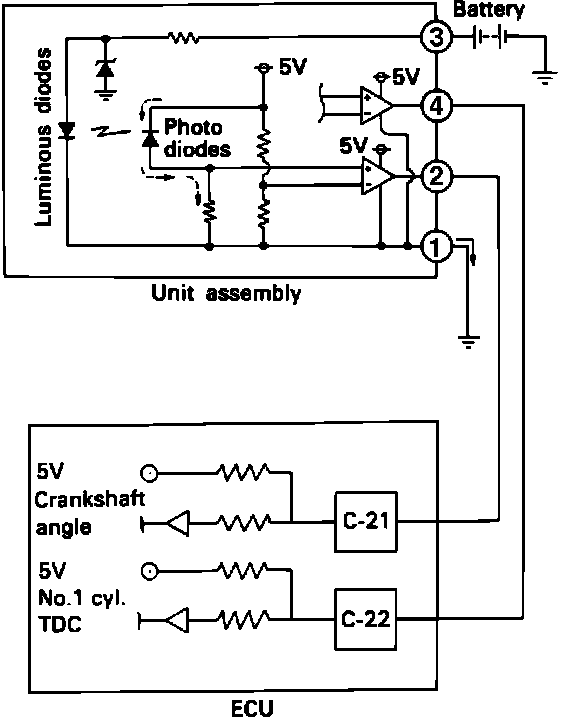 3. When the voltage is abnormal, check the sensor power and ground circuits. If nothing unusual is found, disassemble and inspect the distributor.