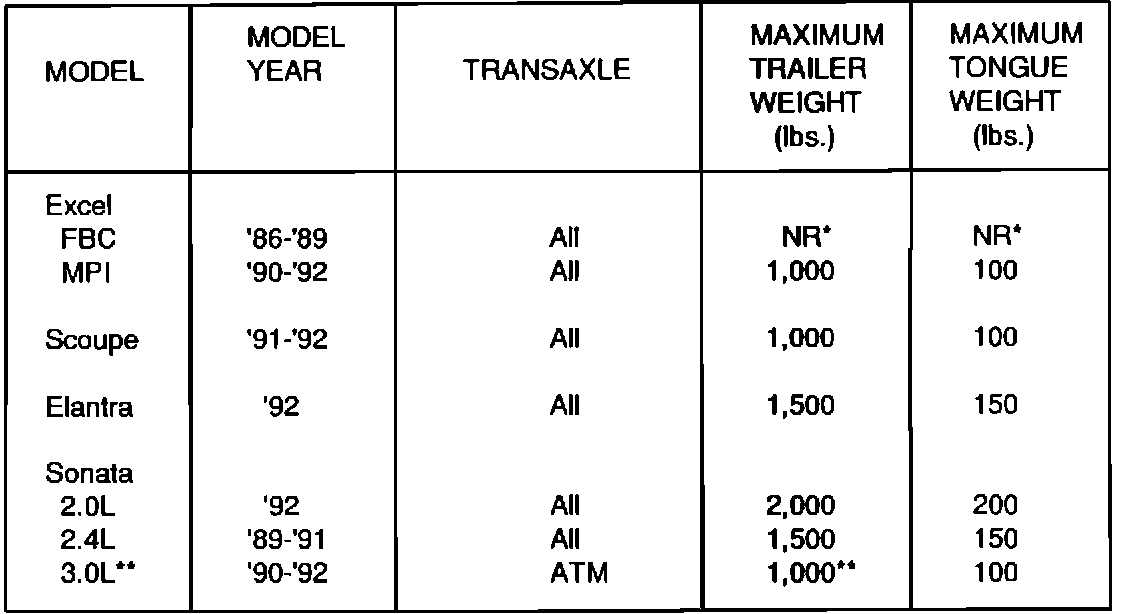 ** Sonata 3.0L is not equipped with a lock-up torque converter, therefore, the towing capacity is lower.