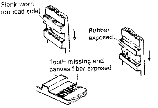 Last stage: Canvas on load side tooth flank worn down and rubber exposed (tooth width reduced).