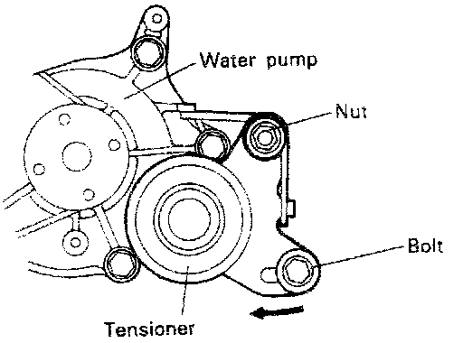 (5) Lift tensioner "B" to tighten timing belt "B" so that its tension side will be pulled tight. In this condition, tighten bolt to secure tensioner "B." When bolt is tightened use care to prevent shaft from turning together. If shaft is turned together belt will be overtightened.