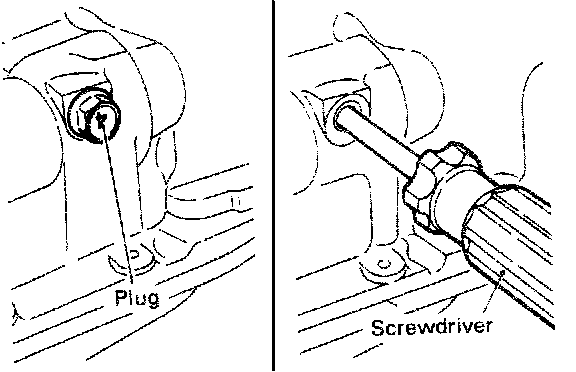 7. When the oil pump sprocket nut is removed, first remove the plug at left side of the cylinder block and insert a screwdriver to keep the left counter balance shaft in position. Screwdriver used for this purpose should have a shaft 8 mm (0.3 in) in diameter which can be inserted more than 60 mm (2.36 in).