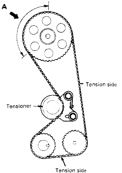 (2) When timing belt "B" is installed make certain that tension side has no slack.