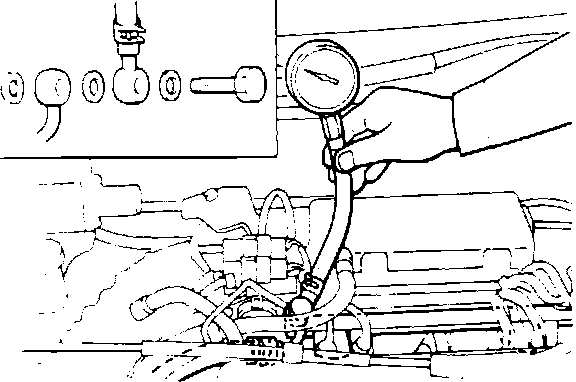 9. Stop the engine and check for a change in fuel pressure readings. Pressure should hold for 5 minutes. If the gauge reading drops, observe the rate of drop. Determine the cause according to the following symptoms.
