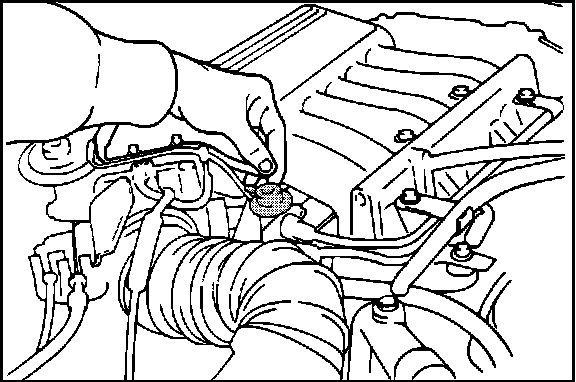 The fuel pump drive terminal (shown hooked-up) is located on the right side of the engine compartment behind the air cleaner housing.