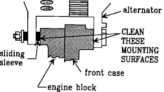 Correction: 1) Remove the alternator from the vehicle and clean the mounting surfaces on both the engine block and the alternator. Make sure to remove any corrosion on the engine block mounting pad and the alternator steel sleeve. Apply a light coat of dielectric grease to all of the mounting surfaces and reinstall the alternator.